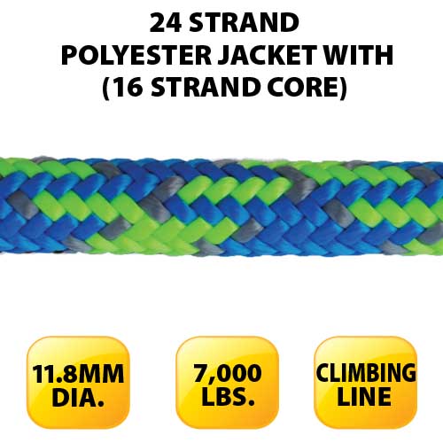11.8mm x 150' 24-strand double braid polyester cover, 16-Strand braided polyester core with a neon coloured 3-strand twisted core. 6,700 Lb. Avg. tensile